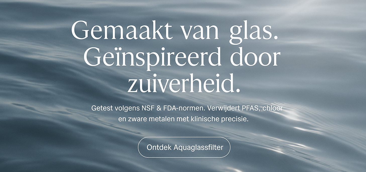 Technische validatie — Het Aquaglassfilter is onafhankelijk getest op verwijdering van PFAS, zware metalen en microplastics. Testmethoden: NSF/ANSI 42 & 53, EPA 200.8 en USEPA 537.1. Gemeten reductie: PFOS > 98 %, PFOA > 96 %, Lood > 99,7 %. Uitgevoerd in 2025 onder labcode C0518081 (NSF-certificering).
